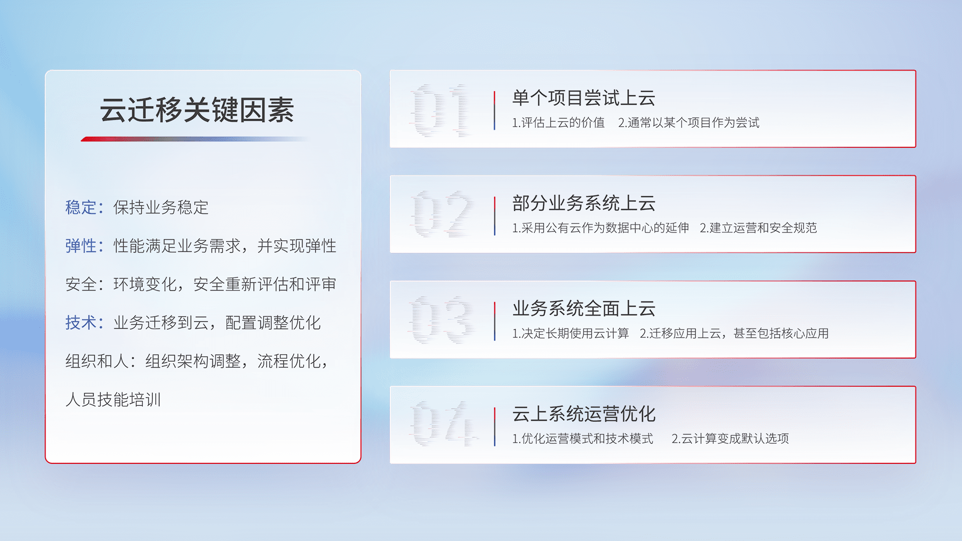 结合实际业务,,,,从规划设计、、、云平台选型、、云原生改造、、、、数据迁移、、、、集成交付,,,,迁移全过程为客户识别最佳上云路径,,,做好风险识别管理,,,设计网络架构、、、、身份权限、、、安全审计合规、、操作审计、、、日志审计、、、监控告警策略、、多站点容灾设计等,,,对云上基础设施进行整体规划,,,提升IT治理水平,,,,以满足弹性、、、高可用、、高性能的需求。。。