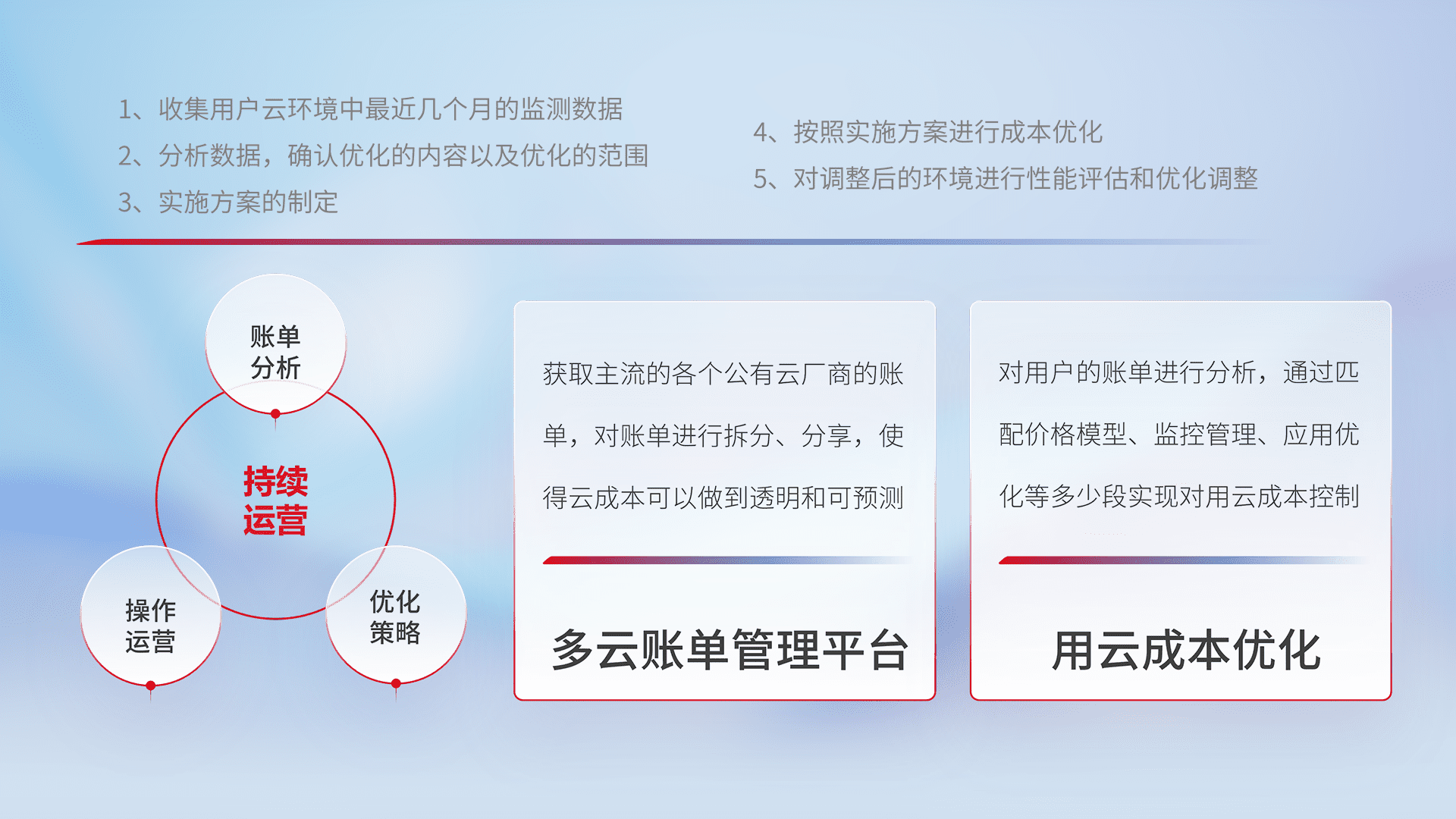 通过多云纳管,,,,以统一的资源数据模型把客户的云资源进行抽象和封装,,进而实现对多云资源的统一操作,,保障云资源管理的可靠性、、稳定性与可用性。。。量身定制化运维内容,,配置、、、开发运维、、、补丁管理、、、、备份、、、监控、、、认证和访问管理、、审计和日常巡检等,,,保障在用云过程中的可靠度,,,稳定度以及高可用率。。